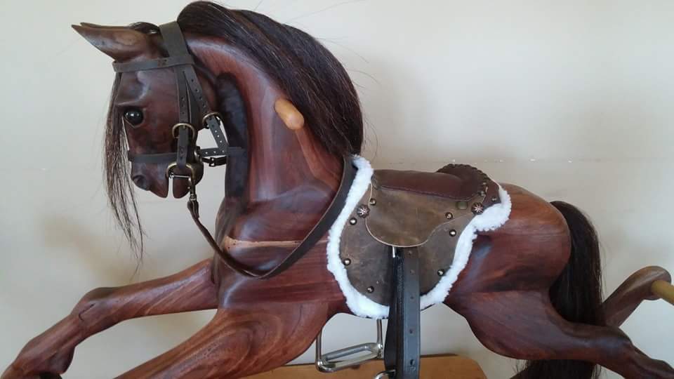 Heartwood Rocking Horses are designed with the child in mind. I don’t always use decorative leather tack or stirrups, because I see children struggle to use these items when riding the horse. I would rather the child have sturdy hand and foot holds and an immovable seat that they can climb on, and be able to explore using their balance and muscles to ride. The foot peg is adjustable and can be moved as a child grows. Horses can always be custom ordered with or without special features or additions.