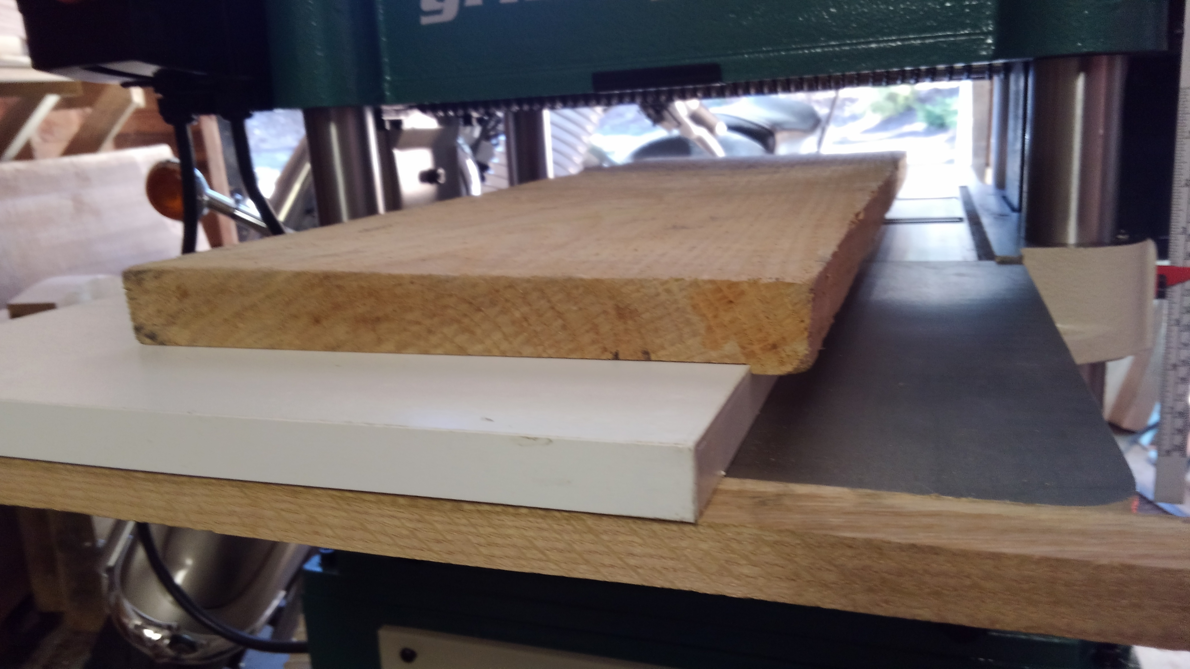 I just screwed a scrap piece of wood to the bottom of a 5/8″ shelf material. This material is slippery and really flat. It does have some give, but it will be supported by the planer beds. I had to sand the edges a bit to remove little raised burrs. Here it is sitting in the planer. It needs to be more narrow than the planer to allow the rabbet edge to sit over the side of it.