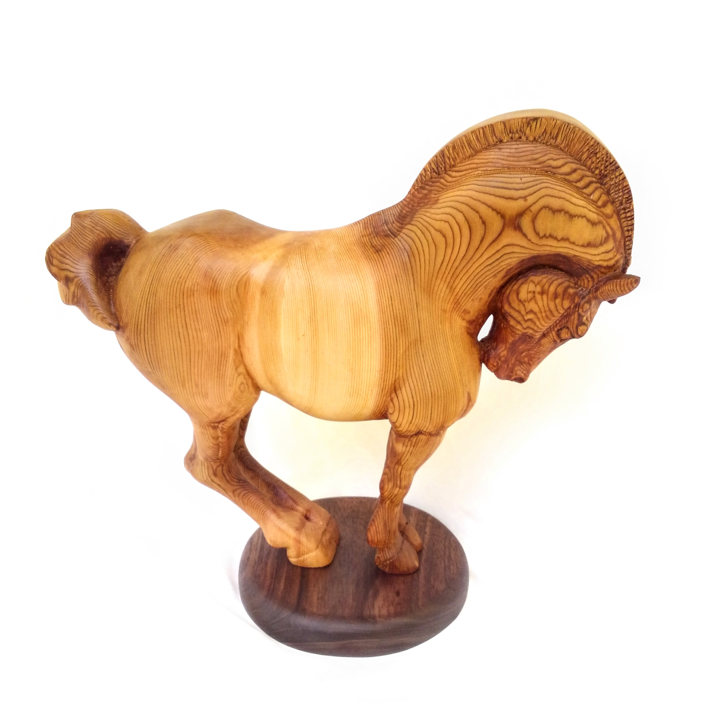 I created this design from a simple drawing based on the idea of a Norwegian Fjord horse. These strong horses are full of beauty and character. I carved this piece from a recycled white cedar beam for shipping heavy machinery. Made from recycled wood that would otherwise have been thrown away, this one of a kind sculpture has meaning and history. The horse is hand carved and sanded to a silky smooth finish, and treated with all natural, non-toxic linseed oil and my home-made oil and wax finish. Walnut circular base.